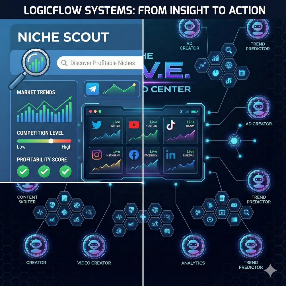 Niche Scout finds profitable opportunities in minutes. The H.I.V.E. creates and posts content across 6 platforms. Together, you go from idea to income on autopilot.